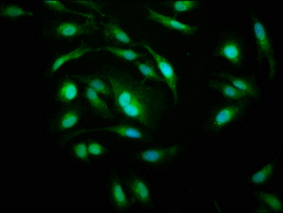 Immunofluorescence staining of Hela cells with CSB-PA018899LA01HU at 1:200, counter-stained with DAPI. The cells were fixed in 4% formaldehyde, permeabilized using 0.2% Triton X-100 and blocked in 10% normal Goat Serum. The cells were then incubated with the antibody overnight at 4°C. The secondary antibody was Alexa Fluor 488-congugated AffiniPure Goat Anti-Rabbit IgG(H+L).