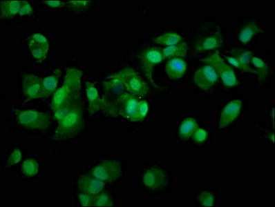 Immunofluorescence staining of MCF-7 cells with CSB-PA00575A0Rb at 1:100, counter-stained with DAPI. The cells were fixed in 4% formaldehyde, permeabilized using 0.2% Triton X-100 and blocked in 10% normal Goat Serum. The cells were then incubated with the antibody overnight at 4°C. The secondary antibody was Alexa Fluor 488-congugated AffiniPure Goat Anti-Rabbit IgG(H+L).