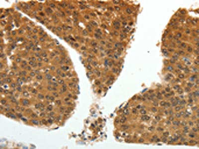 The image on the left is immunohistochemistry of paraffin-embedded Human liver cancer tissue using CSB-PA644570(PSMD14 Antibody) at dilution 1/20, on the right is treated with fusion protein. (Original magnification: ×200)