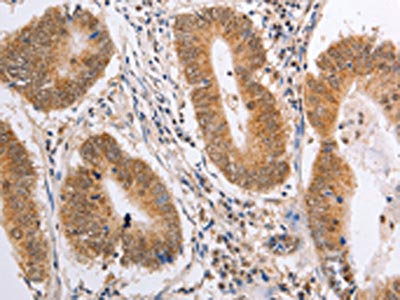 The image on the left is immunohistochemistry of paraffin-embedded Human colon cancer tissue using CSB-PA252995(PSMD3 Antibody) at dilution 1/25, on the right is treated with fusion protein. (Original magnification: ×200)