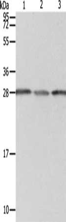 Gel: 12%SDS-PAGE, Lysate: 40 μg, Lane 1-3: A549 cells, human liver cancer tissue, Human fetal kidney tissue, Primary antibody: CSB-PA576314(PSMD9 Antibody) at dilution 1/800, Secondary antibody: Goat anti rabbit IgG at 1/8000 dilution, Exposure time: 10 seconds