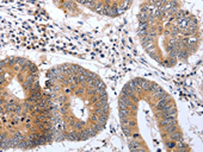 The image on the left is immunohistochemistry of paraffin-embedded Human colon cancer tissue using CSB-PA559966(PSPN Antibody) at dilution 1/25, on the right is treated with synthetic peptide. (Original magnification: ×200)