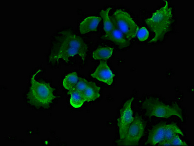 Immunofluorescent analysis of MCF-7 cells using CSB-PA614448LA01HU at dilution of 1:100 and Alexa Fluor 488-congugated AffiniPure Goat Anti-Rabbit IgG(H+L)