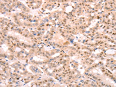 The image on the left is immunohistochemistry of paraffin-embedded Human thyroid cancer tissue using CSB-PA272943(PTMA Antibody) at dilution 1/25, on the right is treated with synthetic peptide. (Original magnification: ×200)