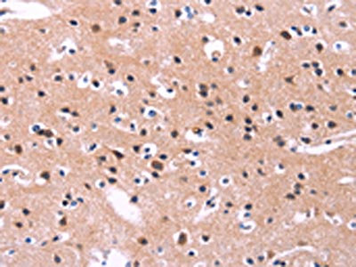 The image on the left is immunohistochemistry of paraffin-embedded Human brain tissue using CSB-PA015132(PTPN13 Antibody) at dilution 1/20, on the right is treated with synthetic peptide. (Original magnification: ×200)