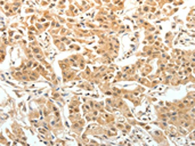 The image on the left is immunohistochemistry of paraffin-embedded Human lung cancer tissue using CSB-PA832569(PTPRE Antibody) at dilution 1/10, on the right is treated with fusion protein. (Original magnification: ×200)