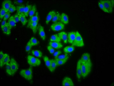 Immunofluorescence staining of HepG2 cells with CSB-PA613588LA01HU at 1:133, counter-stained with DAPI. The cells were fixed in 4% formaldehyde, permeabilized using 0.2% Triton X-100 and blocked in 10% normal Goat Serum. The cells were then incubated with the antibody overnight at 4°C. The secondary antibody was Alexa Fluor 488-congugated AffiniPure Goat Anti-Rabbit IgG(H+L).