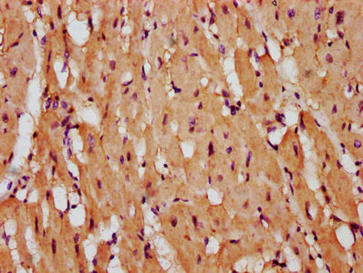 IHC image of CSB-PA613588LA01HU diluted at 1:400 and staining in paraffin-embedded human heart tissue performed on a Leica BondTM system. After dewaxing and hydration, antigen retrieval was mediated by high pressure in a citrate buffer (pH 6.0). Section was blocked with 10% normal goat serum 30min at RT. Then primary antibody (1% BSA) was incubated at 4°C overnight. The primary is detected by a biotinylated secondary antibody and visualized using an HRP conjugated SP system.