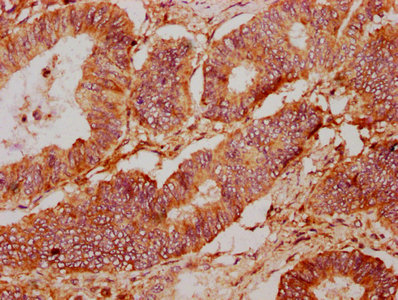 IHC image of CSB-PA613588LA01HU diluted at 1:400 and staining in paraffin-embedded human colon cancer performed on a Leica BondTM system. After dewaxing and hydration, antigen retrieval was mediated by high pressure in a citrate buffer (pH 6.0). Section was blocked with 10% normal goat serum 30min at RT. Then primary antibody (1% BSA) was incubated at 4°C overnight. The primary is detected by a biotinylated secondary antibody and visualized using an HRP conjugated SP system.