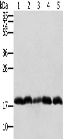 Gel: 12%SDS-PAGE, Lysate: 40 μg, Lane 1-5: Raji cells, Jurkat cells, 231 cells, hepg2 cells, K562 cells, Primary antibody: CSB-PA846950(PTRH2 Antibody) at dilution 1/250, Secondary antibody: Goat anti rabbit IgG at 1/8000 dilution, Exposure time: 20 seconds