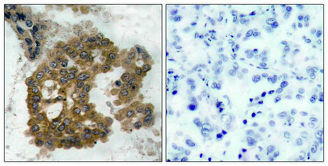 Immunohistochemical analysis of paraffin-embedded human lung carcinoma tissue using Akt2(Phospho-Ser474) Antibody(left) or the same antibody preincubated with blocking peptide(right).