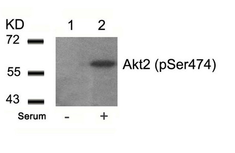 Western blot analysis of extracts from 293 cells untreated(lane 1) or treated with serum(lane 2) using Akt2(Phospho-Ser474) Antibody.