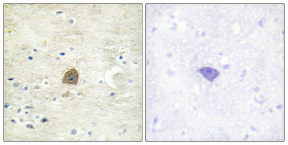 Immunohistochemical analysis of paraffin-embedded human brain tissue using CaMKII (Phospho-Thr305) antibody (left)or the same antibody preincubated with blocking peptide (right).