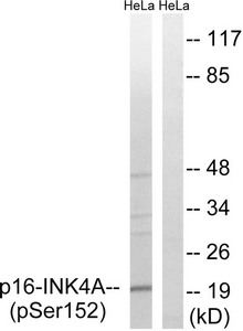 Western blot analysis of extracts from HeLa cells, treated with EPO (20U/ml, 15mins), using p16-INK4a (Phospho-Ser152) antibody. The lane on the right is treated with the synthesized peptide.