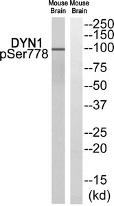 Western blot analysis of extracts from Mouse brain cells, using DYN1 (Phospho-Ser778) antibody. The lane on the right is treated with the synthesized peptide.