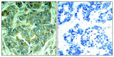 Immunohistochemical analysis of paraffin-embedded human breast carcinoma tissue using p62Dok(Phospho-Tyr398) Antibody(left) or the same antibody preincubated with blocking peptide(right).