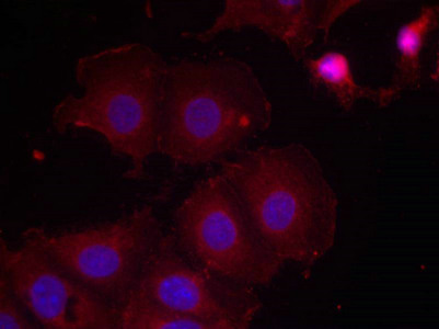 Immunofluorescence staining of methanol-fixed MCF7 cells using HER2(Phospho-Tyr877) Antibody.