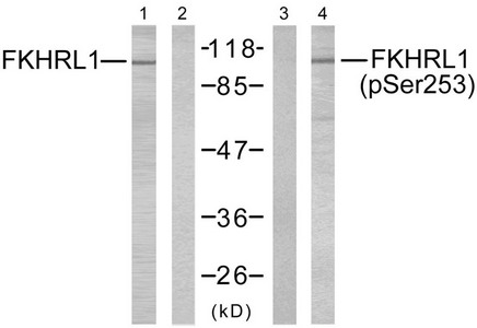 Western blot analysis of extracts from NIH/3T3 cells using FKHRL1 (Ab-253) antibody (Lane 1 and 2) and FKHRL1 (phospho-Ser253) antibody (Lane 3 and 4).