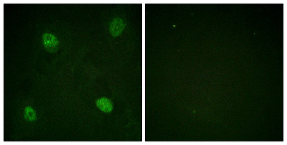 Immunofluorescence staining of methanol-fixed HeLa cells using hnRPD (Phospho-Ser83) Antibody.