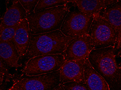 Immunofluorescence staining of methanol-fixed MCF7 cells using IGF-1R (phospho-Tyr1161) antibody.
