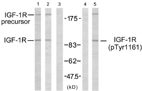Western blot analysis using IGF-1R (Ab-1161) antibody (Line 1, 2 and 3) and IGF-1R (phospho-Tyr1161) antibody (Line 4 and 5).