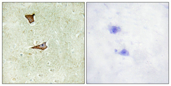 Immunohistochemical analysis of paraffin-embedded human brain tissue using IGF2R (Phospho-Ser2409) antibody (left)or the same antibody preincubated with blocking peptide (right).