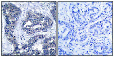 Immunohistochemical analysis of paraffin-embedded human breast carcinoma tissue using IRS-1(Phospho-Ser639) Antibody(left) or the same antibody preincubated with blocking peptide(right).