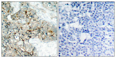 Immunohistochemical analysis of paraffin-embedded human breast carcinoma tissue using Integrin b3(Phospho-Tyr773) Antibody(left) or the same antibody preincubated with blocking peptide(right).