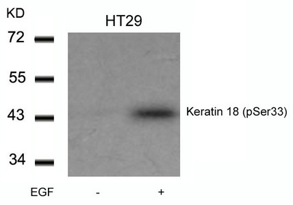 Western blot analysis of extracts from HT29 cells untreated or treated with EGF using Keratin 18(Phospho-Ser33) Antibody.