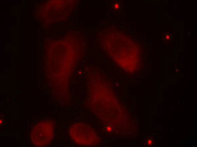 Immunofluorescence staining of methanol-fixed Hela cells using LIMK1(Phospho-Thr508) Antibody.