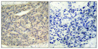 Immunohistochemical analysis of paraffin-embedded human breast carcinoma tissue using LIMK1(Phospho-Thr508) Antibody(left) or the same antibody preincubated with blocking peptide(right).