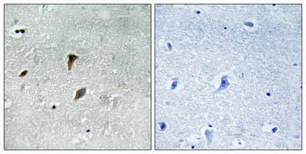 Immunohistochemical analysis of paraffin-embedded human brain tissue using MAP2K3 (Phospho-Thr222) antibody (left)or the same antibody preincubated with blocking peptide (right).