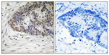 Immunohistochemistry analysis of paraffin-embedded human colon carcinoma tissue using MDM4 (Phospho-Ser367) antibody. The picture on the right is treated with the synthesized peptide.