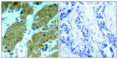 Immunohistochemical analysis of paraffin-embedded human breast carcinoma tissue using mTOR(Phospho-Ser2448) Antibody(left) or the same antibody preincubated with blocking peptide(right).
