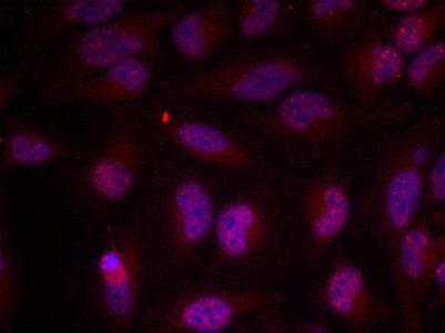 Immunofluorescence staining of methanol-fixed Hela cells using Myc(Phospho-Thr358) Antibody.