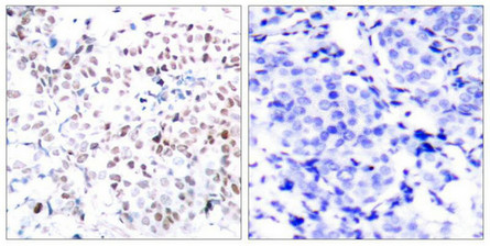 Immunohistochemical analysis of paraffin-embedded human breast carcinoma tissue using Myc(Phospho-Thr358) Antibody(left) or the same antibody preincubated with blocking peptide(right).