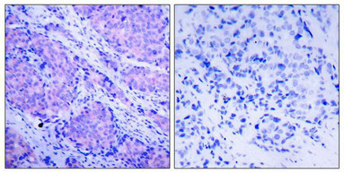 Immunohistochemical analysis of paraffin-embedded human breast carcinoma tissue using PDK1(Phospho-Ser241) Antibody(left) or the same antibody preincubated with blocking peptide(right).