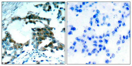 Immunohistochemical analysis of paraffin-embedded human lung carcinoma tissue using PKCth(Phospho-Ser695) Antibody(left) or the same antibody preincubated with blocking peptide(right).
