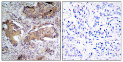 Immunohistochemical analysis of paraffin- embedded human breast carcinoma tissue using PTEN (phospho-Ser370) antibody.
