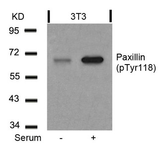Western blot analysis of extracts from 3T3 cells untreated or treated with serum using Paxillin(Phospho-Tyr118) Antibody.