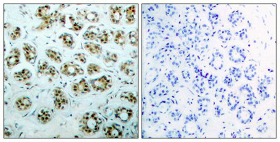 Immunohistochemical analysis of paraffin-embedded human breast carcinoma tissue, using NFκB-p65 (phospho-Ser311) antibody.