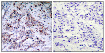 Immunohistochemical analysis of paraffin-embedded human breast carcinoma tissue using NF-kB p65(phospho-Thr435) antibody.