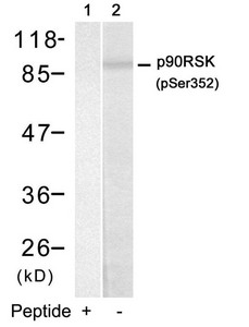 Western blot analysis of extracts from HUVEC cells using p90RSK(Phospho-Ser352) Antibody(Lane 2) and the same antibody preincubated with blocking peptide(Lane1).
