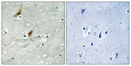 Immunohistochemistry analysis of paraffin-embedded human brain tissue using MSK2 (Phospho-Thr568) antibody. The picture on the right is treated with the synthesized peptide.