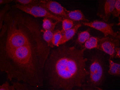 Immunofluorescence staining of methanol-fixed Hela cells using STAT3(Phospho-Ser727) Antibody.