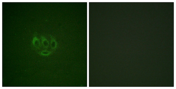 Immunofluorescence staining of methanol-fixed A549 cells using ACK1 (Phospho-Tyr284) Antibody.