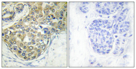 Immunohistochemical analysis of paraffin-embedded human breast carcinoma tissue using ACK1 (Phospho-Tyr284) antibody (left)or the same antibody preincubated with blocking peptide (right).