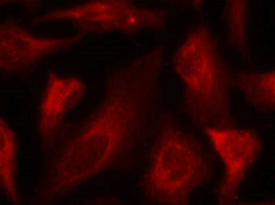 Immunofluorescence staining of methanol-fixed Hela cells using p53(Phospho-Ser33) Antibody.