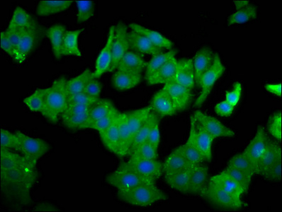 Immunofluorescence staining of HepG2 cells with CSB-PA621868LA01HU at 1:100, counter-stained with DAPI. The cells were fixed in 4% formaldehyde, permeabilized using 0.2% Triton X-100 and blocked in 10% normal Goat Serum. The cells were then incubated with the antibody overnight at 4°C. The secondary antibody was Alexa Fluor 488-congugated AffiniPure Goat Anti-Rabbit IgG(H+L).