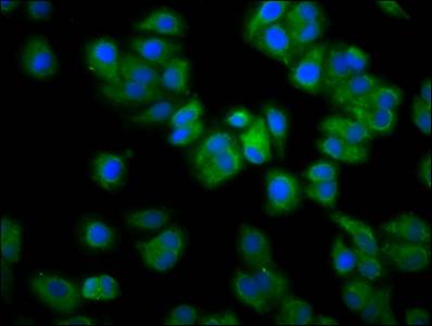 Immunofluorescence staining of HepG2 cells with CSB-PA891733LA01HU at 1:133, counter-stained with DAPI. The cells were fixed in 4% formaldehyde, permeabilized using 0.2% Triton X-100 and blocked in 10% normal Goat Serum. The cells were then incubated with the antibody overnight at 4°C. The secondary antibody was Alexa Fluor 488-congugated AffiniPure Goat Anti-Rabbit IgG(H+L).
